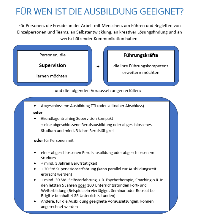 - Mind. 25 Std. durchgeführte Lernsupervision (davon mind. 10 Einzel-, 5 Team-, und 5 Einzel-, Team oder Gruppensupervisionen)